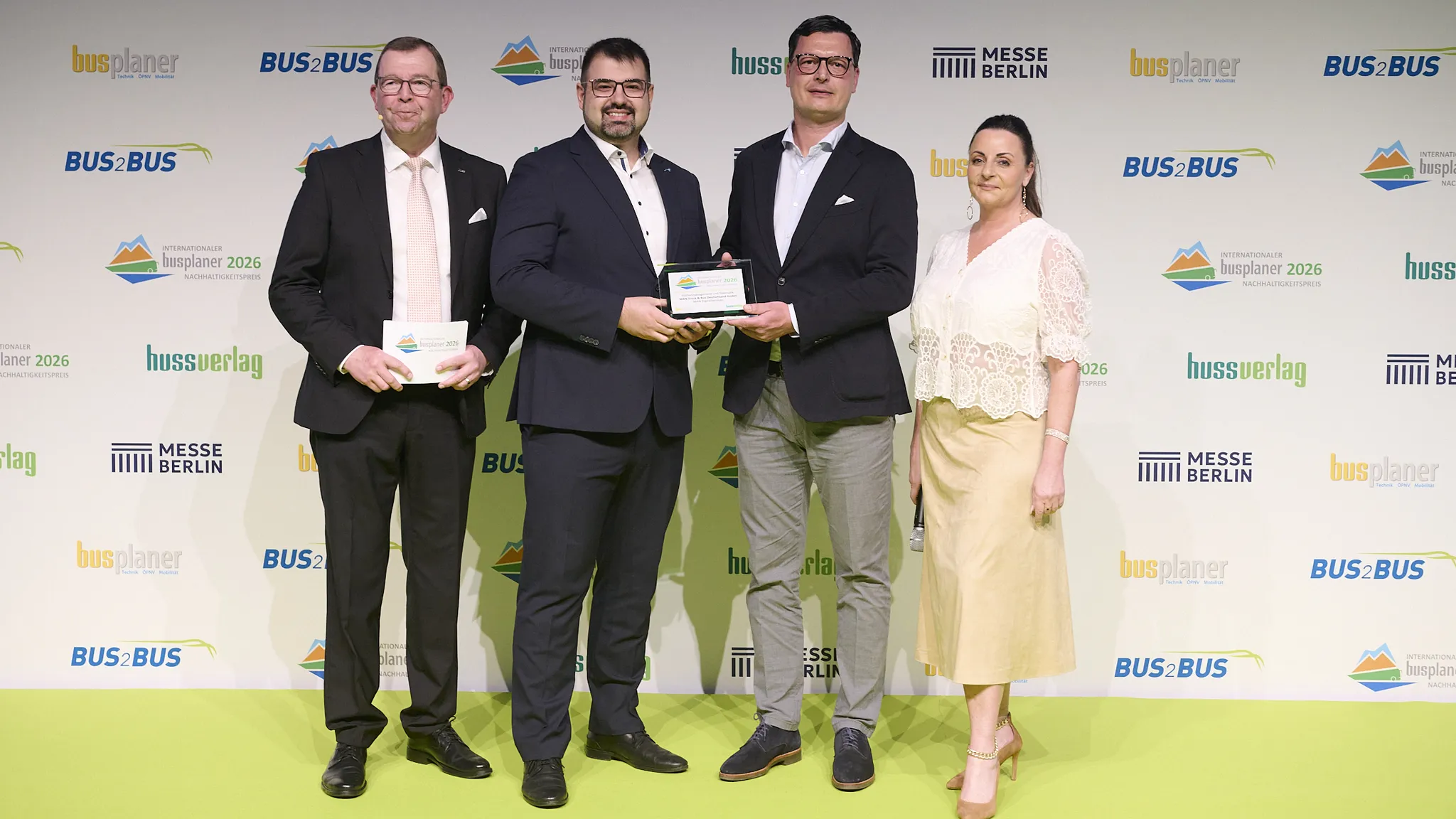 Nachhaltig erfolgreich: MAN Truck & Bus sicherte sich beim diesjährigen „Internationalen busplaner Nachhaltigkeitspreis“ gleich zwei der begehrten Auszeichnungen. Der vollelektrische Lion's Coach E gewann in der Kategorie „Reisebusse“, während die MAN DigitalServices in der Kategorie „Flottenmanagement und Telematik“ den ersten Platz belegten. Verliehen wurden die Preise gestern im Rahmen der „Award Night“ am Vorabend der BUS2BUS in Berlin. Die Fachzeitschrift busplaner aus dem Huss-Verlag vergab den „Internationalen busplaner Nachhaltigkeitspreis“ 2026 bereits zum siebten Mal. Ausgezeichnet wurden herausragende nachhaltige Leistungen in insgesamt 15 Kategorien. Eine Jury aus Branchenexperten bewertete dazu von der Redaktion des „busplaner“ nominierte innovative und praxistaugliche Lösungen – von zukunftsweisenden Fahrzeugen über Ausstattung und Komponenten bis hin zu Dienstleistungen im Busgewerbe.