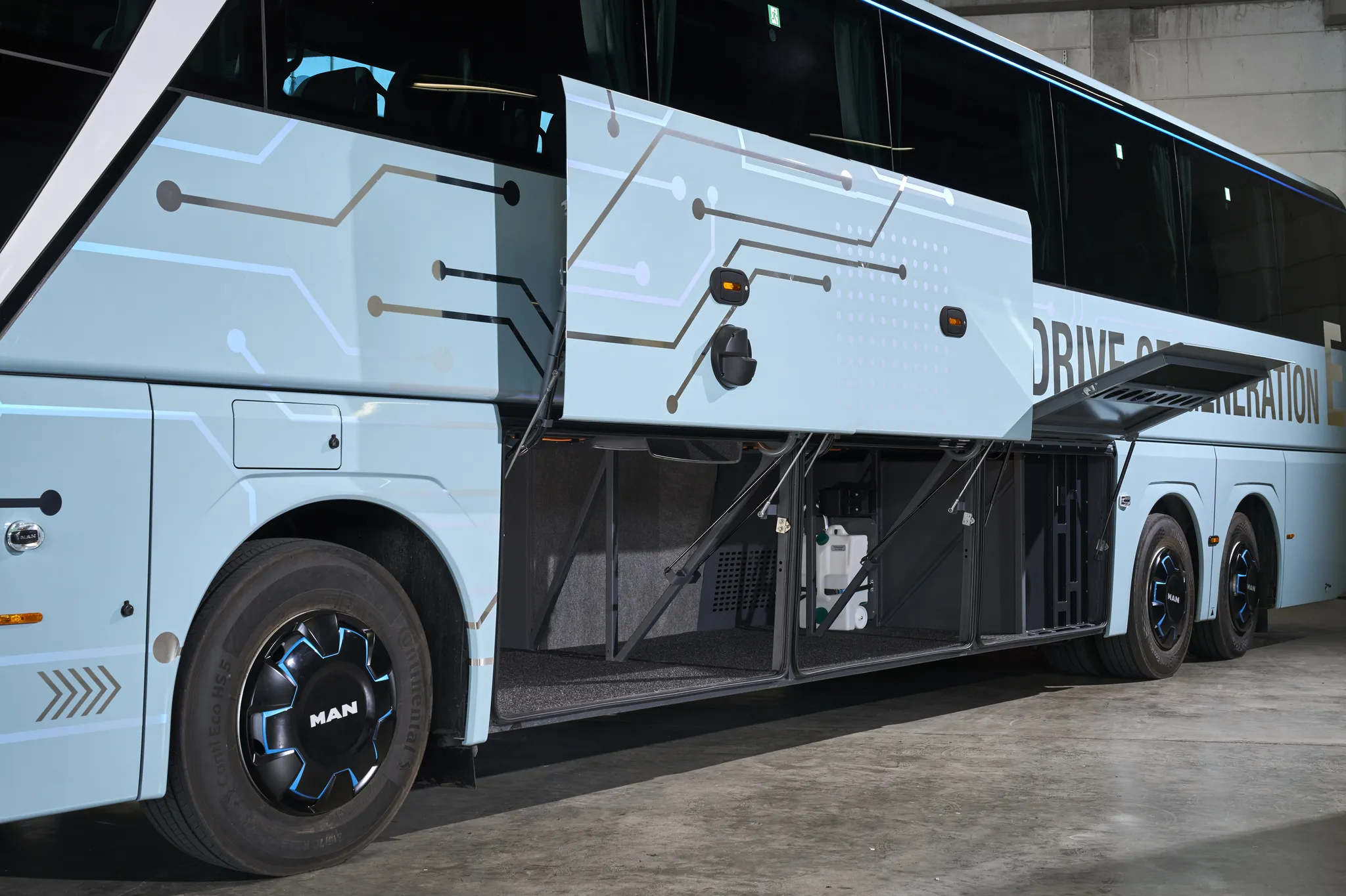 Herzstück ist ein modulares Batteriesystem mit einer nutzbaren Kapazität von 320 bis 480 kWh. Die modernen NMC-Batterie-Packs stammen aus dem MAN-Werk in Nürnberg, was Lieferketten vereinfacht und die regionale Wertschöpfung stärkt. Sie sind speziell für den Nutzfahrzeugeinsatz ausgelegt, was eine Lebensdauer von bis zu 15 Jahren beziehungsweise rund einer Million Kilometer ermöglicht. Für hohe Effizienz und Zuverlässigkeit sorgt zudem das aerodynamisch optimierte Design.